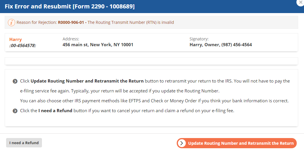 Check the payment details you have entered while filing your Form 2290 return. Make sure to enter the correct Bank Routing Number. The Bank Routing number is a nine-digit code that will be present on the bottom left of your check. You can re-enter this information and transmit your return to the IRS again. Please double check your Bank Routing Number before transmitting it to the IRS.